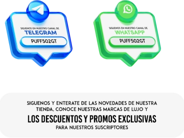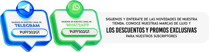 Superamos las  expectativas de calidad  de nuestros clientes  estamos comprometidos con impulsar el vapeo en  Guatemala. Vendemos  unaexperiencia de lujo y  sabor.   Trabajamos con  transparencia,  Contamos con GARANTIA  por defectos de fábrica,  Líquido derramado,  problemas de carga,  vapor o por sabor a  quemado.  Porque elegir Puff502?  Somos la única Vape Shop que vendemos  productos 100% originales  y de la mas alta calidad.  Somos la tienda con las marcas mas exclusivas  y top de la ciudad Nuestro parámetro de calidad es superar tus expectativas  es por eso ofrecemos una garantía de satisfacción del  100% en todas nuestras marcas, hasta 24 horas después  de tu compra, por: defectos de fábrica, liquido derramado,  problemas de carga, de vapor o por sabor a quemado y sin costos adicionales.  GARANTÍA DE SATISFACCIÓN DEL 100% SIN COSTO ADICIONAL Bono de descuento